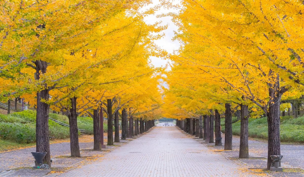 中央園路に116本ものイチョウが植えられ、秋にはトンネル状に黄金色の並木道が広がります。