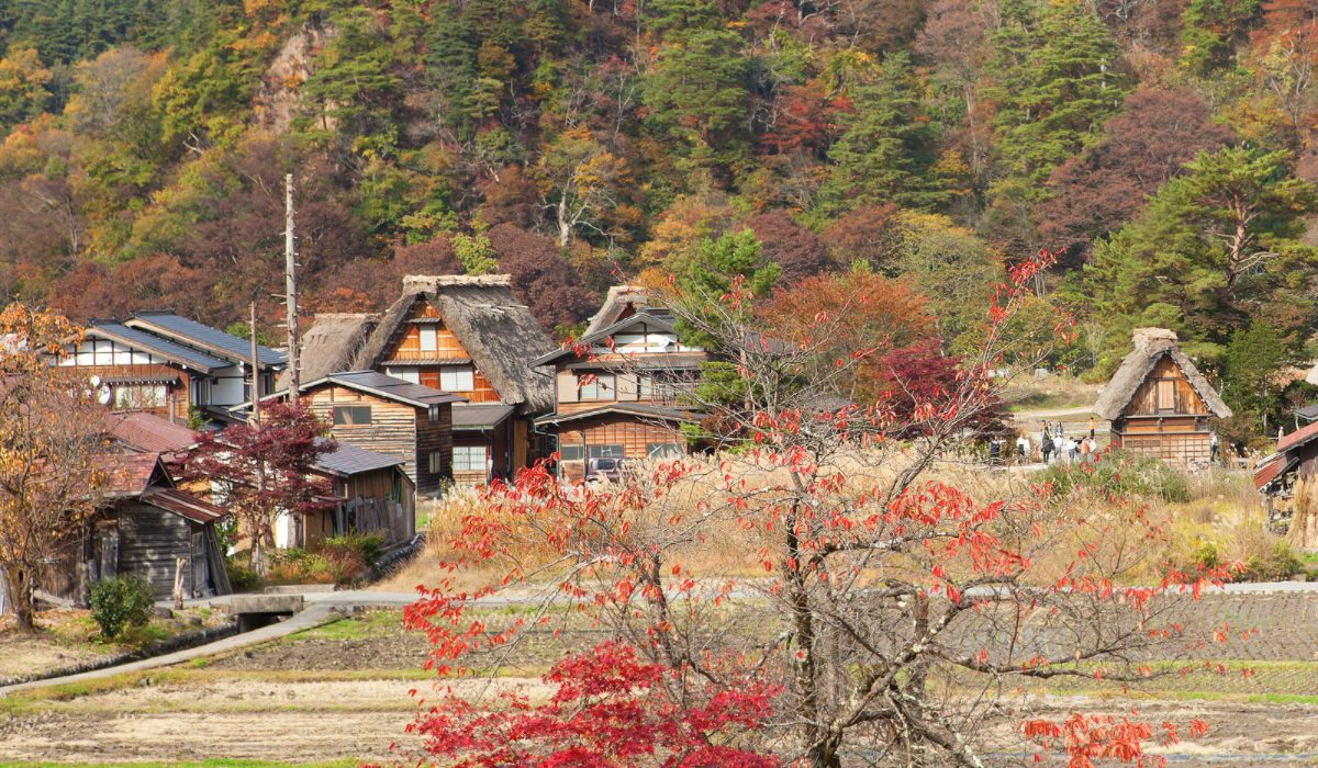 茅葺き屋根と赤や黄色に染まる木々が美しいコントラストを作り出します。