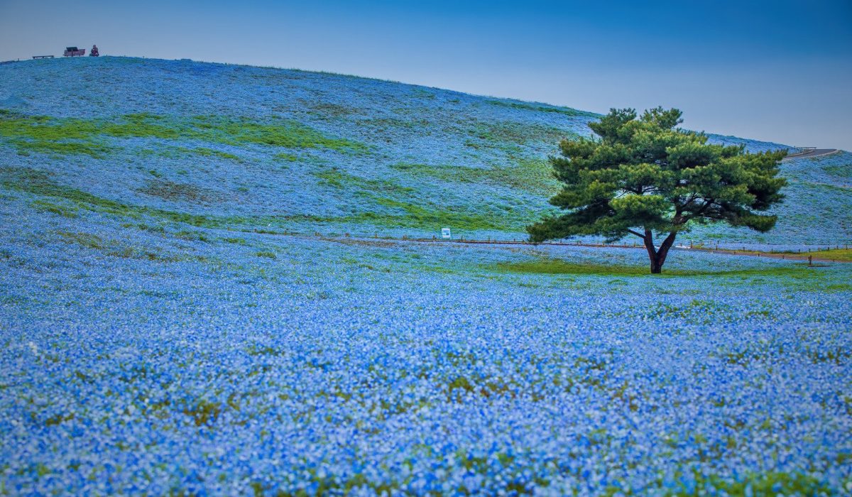 園内の「みはらしの丘」一面に咲き誇る約530万本のネモフィラは、“青い絨毯”とも称される幻想的な景色です 。