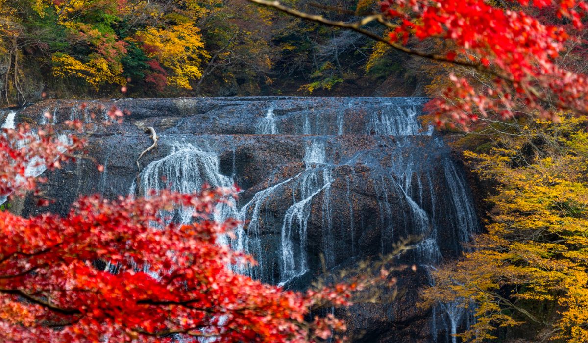 落差120mの巨大な滝を背景に、鮮やかに色づいた紅葉が映える姿は圧巻です。