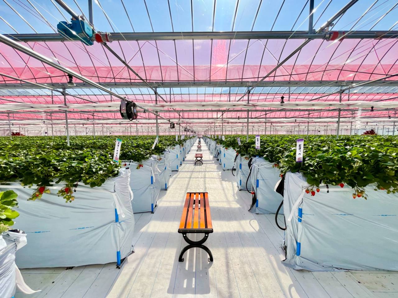 通路を広めに設計した高設栽培ハウスは、ベビーカーや車イスのお客様も無理なく楽しめる設計。清潔な設備や駐車場も整っていて安心して訪れられるのも嬉しいポイント。