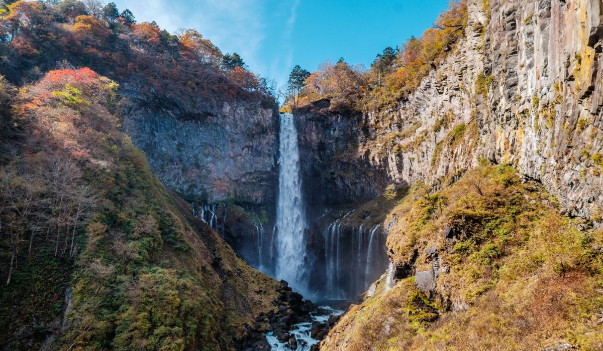 中禅寺湖から流れ出た水が岩壁を切り裂くように落下する姿は圧巻で、四季折々に違った表情を見せてくれるのが大きな魅力です。
