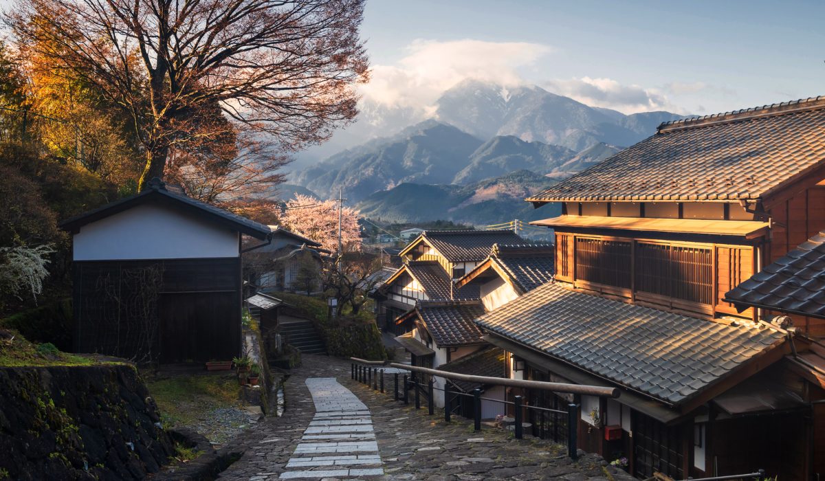 石畳の坂道に沿って、昔ながらの木造家屋が立ち並ぶ馬籠宿(まごめじゅく)。
