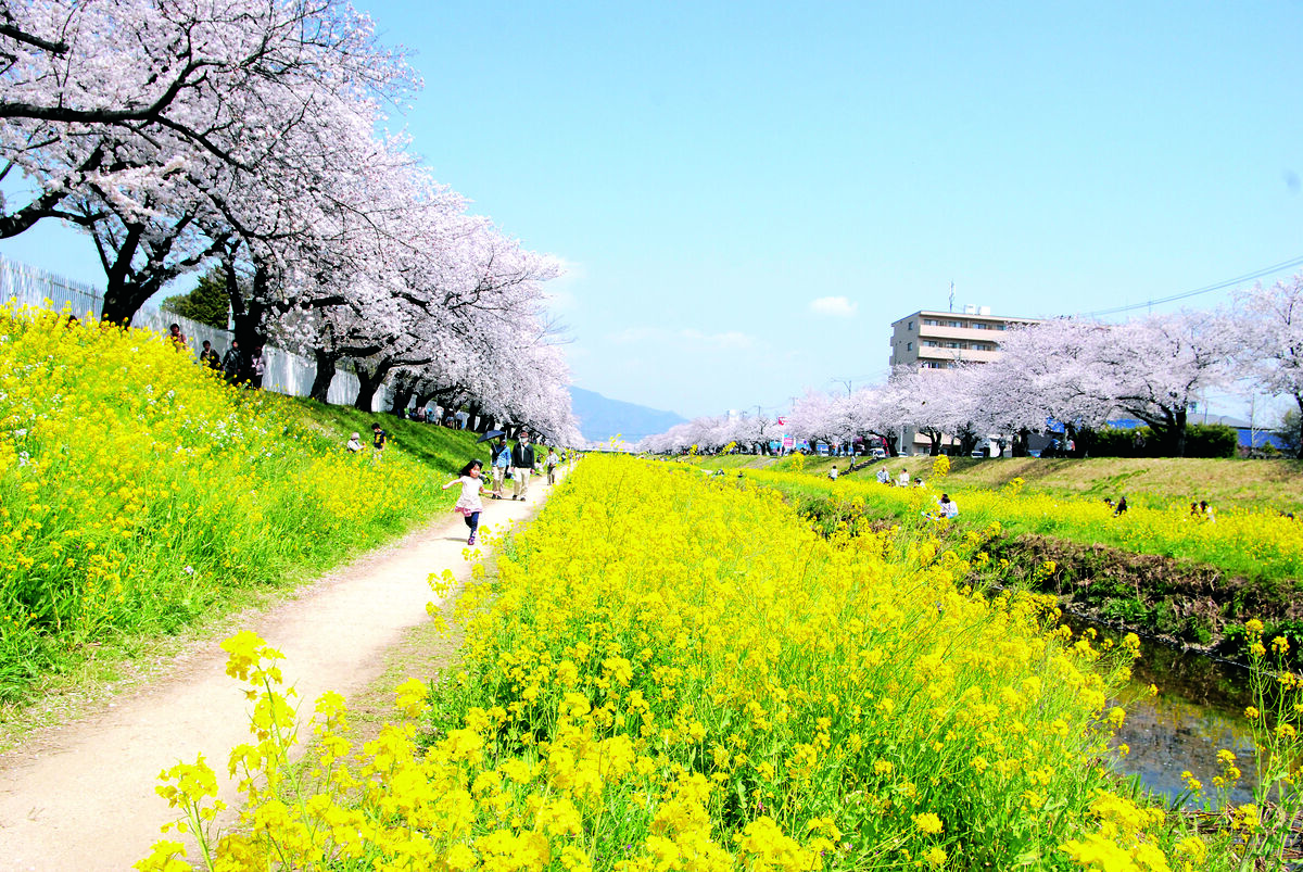 春には桜だけでなく、川原一面に 菜の花(黄色) も咲き、一緒に見ることで ピンク×黄色の華やかな春景色が楽しめます📸。とくに「開運橋」からの眺めは人気の撮影スポットです。