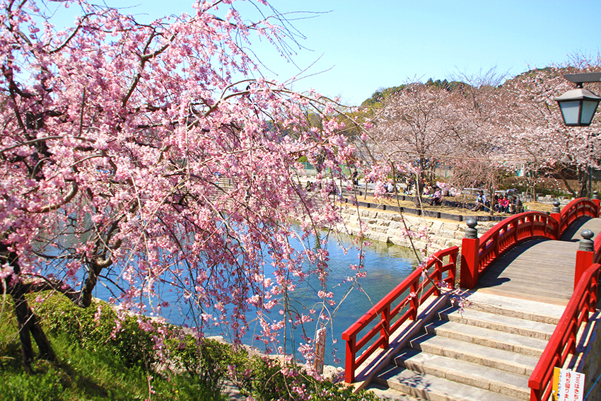 徳島駅から徒歩圏内にある徳島中央公園は、徳島城跡を整備してつくられた歴史ある公園。春になると園内には桜が咲き誇り、城跡やお堀、門などの歴史的な景観とともにお花見を楽しめます。広々とした芝生や散策路が整備されているため、ゆっくり歩きながら春の景色を満喫できるのも魅力。昼の爽やかな桜はもちろん、ライトアップされた夜桜もロマンチックで、のんびり過ごすお花見デートにぴったりのスポットです!