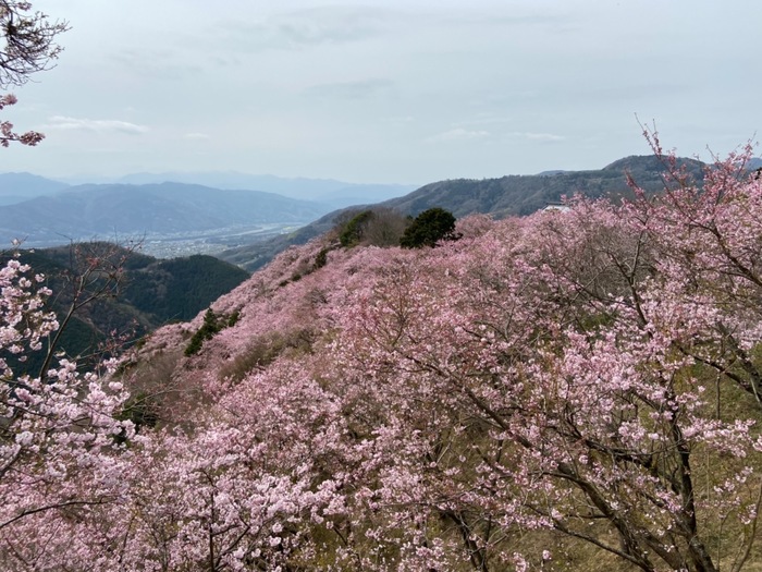 境内や山肌にはソメイヨシノを中心に約8,000本もの桜が植えられており、満開になると山一面が淡いピンク色に染まる壮大な景色が広がります。徳島県内でも屈指のスケールを誇る桜の名所として知られています。