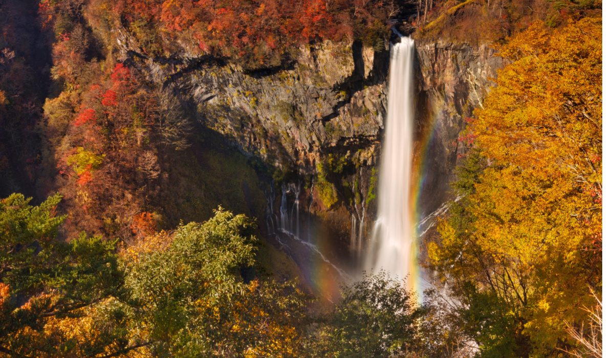 「日本の滝百選」に選ばれる霧降の滝と紅葉の組み合わせは圧巻。観瀑台からの眺めはまさに絶景です。